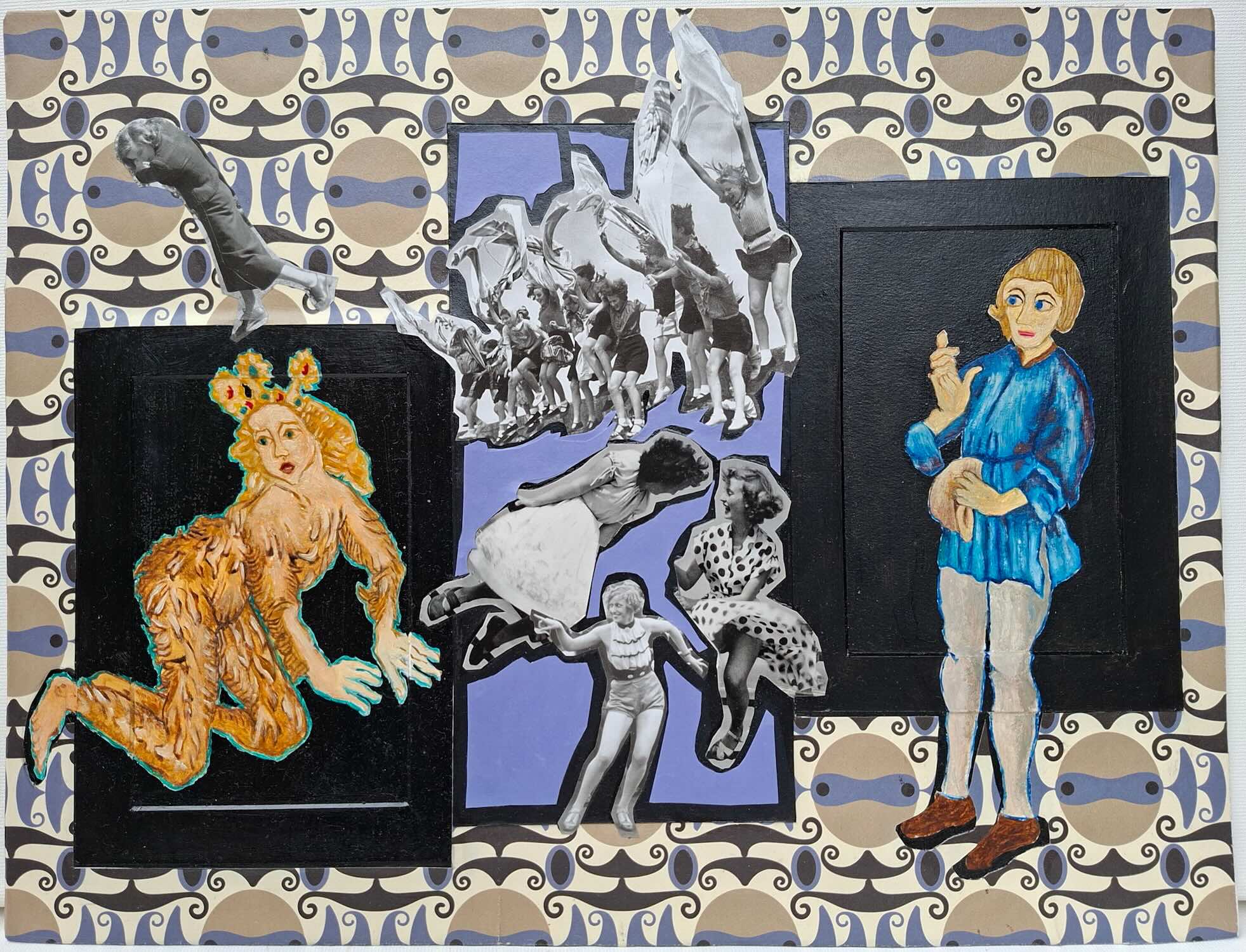 Das Material das mich inspiriert liegt in der unterschiedlichen Ästhetik und Form von Fotografien, Zeitschriften, Reproduktionen bekannter Gemälde, Eintrittskarten aus Museen, Ausstellungen, oder einfachen Bonbonpapieren. Sie bilden ihr eigenes Universum. Jede Figur wird in ihrer Momentaufnahme "anders". Ich füge sie in einem ständigen Dialog oder Tanz zusammen. Die visuelle Wahrnehmung, die Welt der Symbole und Allegorien hat mich schon immer begleitet und inspiriert, sei es als Choreographin, Dozentin, Malerin. Meine Ausbildung an der Accademia Albertina delle belle Arti in Turin/Italien, und meine beruflichen Engagements bilden das Fundament meiner Bilder.